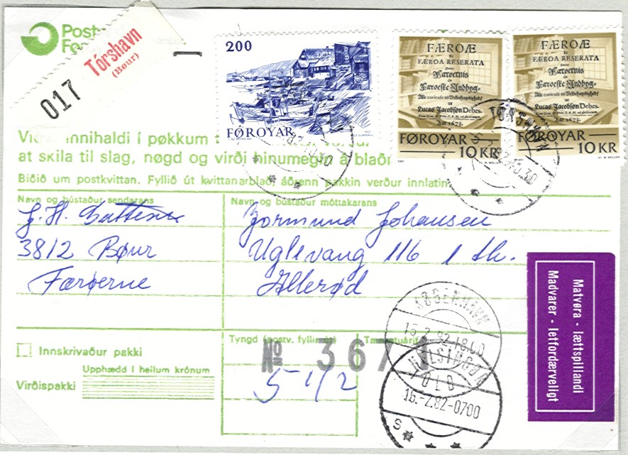 Today, however, there are no label for parcel cards for packets sent by Postverk Føroya’s service. Ordinary Parcel Cards (fig.1) for mail to Denmark and other countries are without labels.